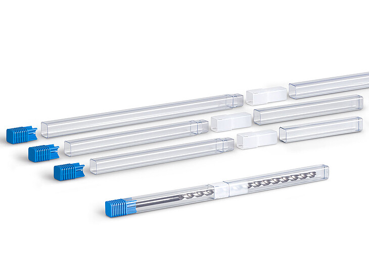 Die Länge der Verpackung passt sich ganz einfach an die Länge des Werkzeugs an: durch die passende Kombination von Mittel- und Außenteilvarianten. So entsteht minimaler Leerraum in der Verpackung und nur die kleinstmögliche Lagerfläche wird benötigt. Die Außen- und Mittelteile bestehen aus hochtransparentem PVC, so ist auf den ersten Blick erkennbar was drin ist.