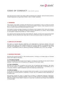 This Code of Conduct provides a framework for ethically correct interaction both within the company and with third parties. The defined principles are minimum standards for our actions. They are based on rose plastic's values and promote our corporate mission statement. Our valued business partners also bear responsibility for integrity, as well as for social and ecological standards. They are therefore also called upon to follow and actively protect this defined code.